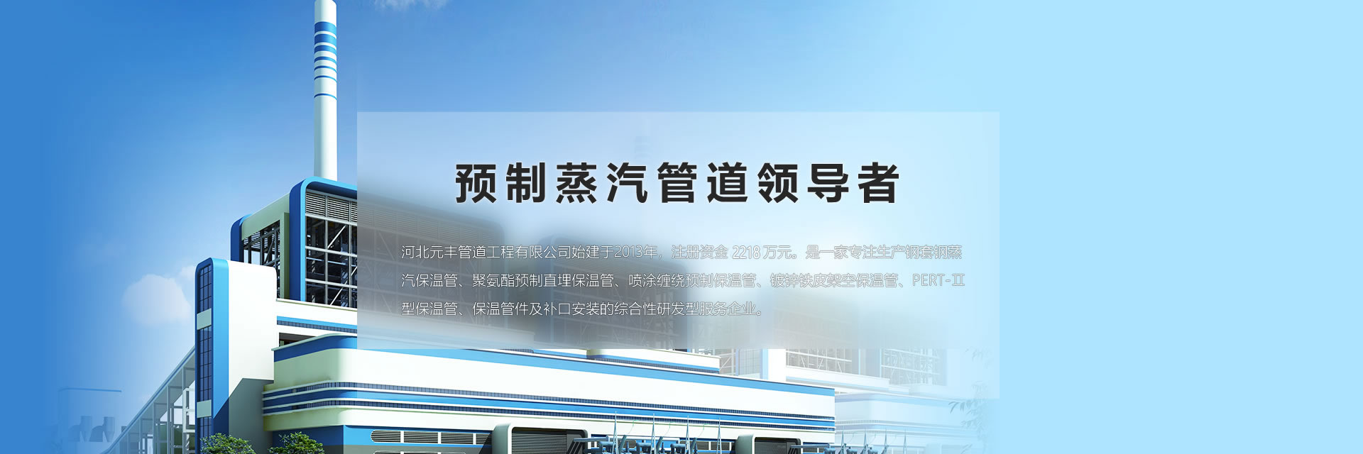 公司在河北、內蒙、天津、遼寧均有生產基地,總占地面積500余畝。公司產品覆蓋中國以及蒙古、俄羅斯、中東、南非等20 多個國家和地區,產品主要應用于高溫蒸汽輸送、集中供熱、集中供冷等。